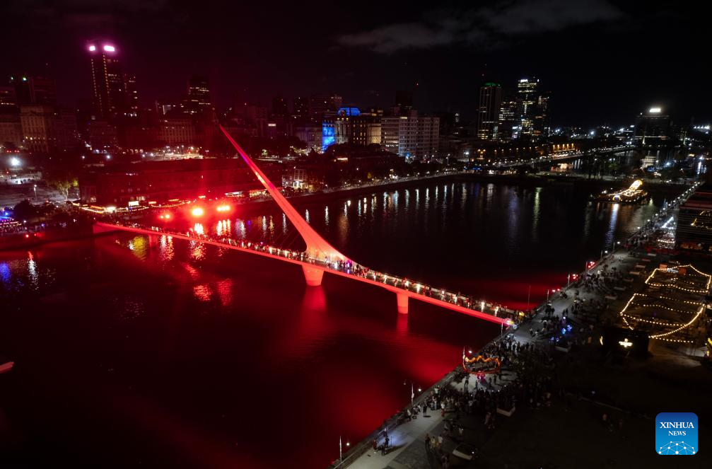 BUENOS AIRES, 17 febrero, 2026 (Xinhua) -- Imagen del 16 de febrero de 2026 del Puente de la Mujer iluminado de rojo durante las celebraciones por el Año Nuevo chino, en la ciudad de Buenos Aires, capital de Argentina. La ciudad de Buenos Aires, capital de Argentina, se engalanó de rojo la noche del lunes para festejar la llegada del Año Nuevo chino iluminando monumentos, edificios y paseos emblemáticos a lo largo de diferentes barrios porteños. (Xinhua/Ezequiel Putruele)