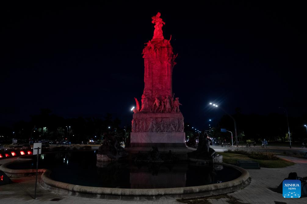 BUENOS AIRES, 17 febrero, 2026 (Xinhua) -- Imagen del 16 de febrero de 2026 del Monumento a los Españoles visto durante un recorrido en un autobús turístico por monumentos iluminados de rojo durante las celebraciones por el Año Nuevo chino, en la ciudad de Buenos Aires, capital de Argentina. La ciudad de Buenos Aires, capital de Argentina, se engalanó de rojo la noche del lunes para festejar la llegada del Año Nuevo chino iluminando monumentos, edificios y paseos emblemáticos a lo largo de diferentes barrios porteños. (Xinhua/Martín Zabala)
