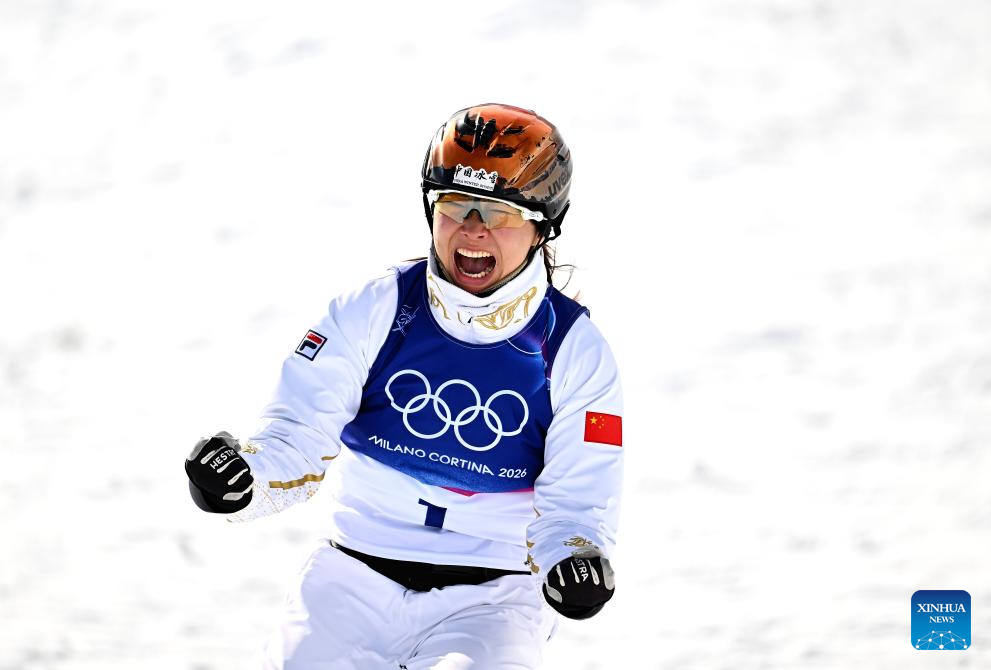 LIVIGNO, 18 febrero, 2026 (Xinhua) -- Xu Mengtao, de China, festeja al término de la final 2 de aerials femenino de esquí acrobático en los Juegos Olímpicos de Invierno Milán-Cortina 2026, en Livigno, Italia, el 18 de febrero de 2026. (Xinhua/Wu Huiwo)