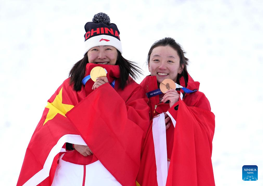 LIVIGNO, 18 febrero, 2026 (Xinhua) -- La medallista de oro Xu Mengtao (i), de China, y la medallista de bronce Shao Qi, de China, posan para fotografías durante la ceremonia de premiación de aerials femenino de esquí acrobático en los Juegos Olímpicos de Invierno Milán-Cortina 2026, en Livigno, Italia, el 18 de febrero de 2026. (Xinhua/Hu Chao)