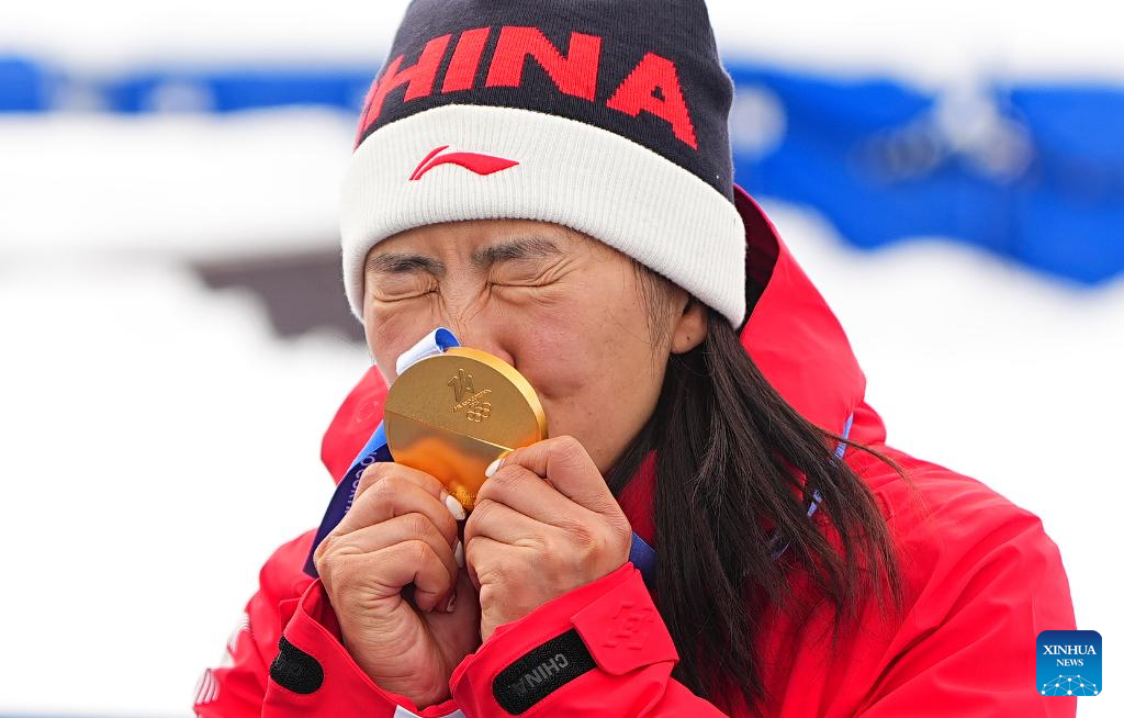 LIVIGNO, 18 febrero, 2026 (Xinhua) -- La medallista de oro, Xu Mengtao, de China, besa su medalla durante la ceremonia de premiación de aerials femenino de esquí acrobático en los Juegos Olímpicos de Invierno Milán-Cortina 2026, en Livigno, Italia, el 18 de febrero de 2026. (Xinhua/Hu Chao)