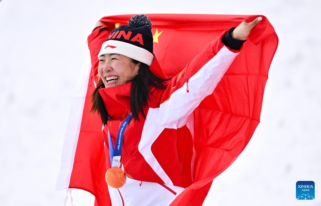 LIVIGNO, 18 febrero, 2026 (Xinhua) -- La medallista de oro, Xu Mengtao, de China, reacciona durante la ceremonia de premiación de aerials femenino de esquí acrobático en los Juegos Olímpicos de Invierno Milán-Cortina 2026, en Livigno, Italia, el 18 de febrero de 2026. (Xinhua/Zhang Hongxiang)