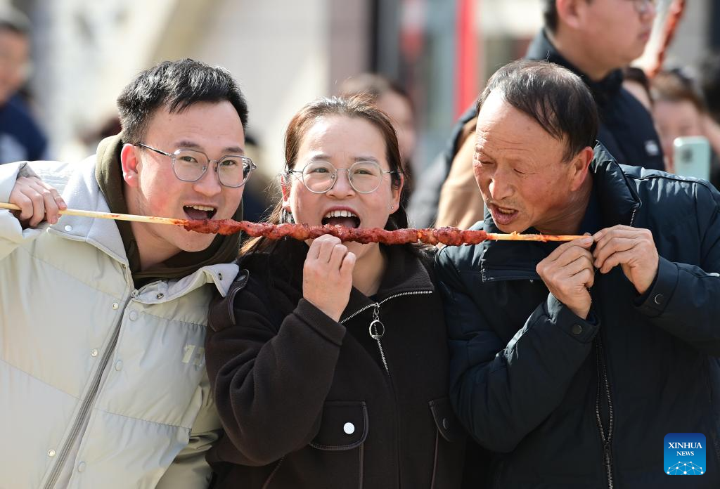 BEIJING, 18 febrero, 2026 (Xinhua) -- Turistas degustan una brocheta de kebab, en Yan'an, en la provincia de Shaanxi, en el noroeste de China, el 18 de febrero de 2026. Durante las vacaciones de la Fiesta de la Primavera, la comida tradicional del Año Nuevo Chino y las cocinas de moda se han convertido en un elemento destacado del consumo vacacional de las personas. (Xinhua/Qi Xiaojun)