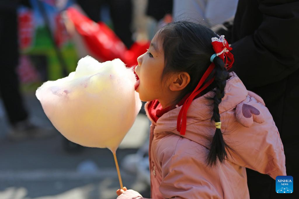 BEIJING, 18 febrero, 2026 (Xinhua) -- Imagen del 17 de febrero de 2026 de una niña degustando algodón de azúcar en un parque, en Tengzhou, en la provincia de Shandong, en el este de China. Durante las vacaciones de la Fiesta de la Primavera, la comida tradicional del Año Nuevo Chino y las cocinas de moda se han convertido en un elemento destacado del consumo vacacional de las personas. (Xinhua/Li Zhijun)