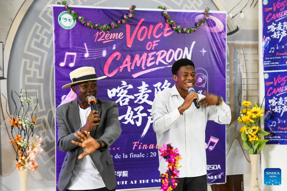 SOA, 20 febrero, 2026 (Xinhua) -- Participantes cantan una canción china en la final de la 12 edición del concurso de canciones chinas "La Voz de Camerún" en la Universidad de Yaundé II, en Soa, Camerún, el 20 de febrero de 2026. (Xinhua/Kepseu)