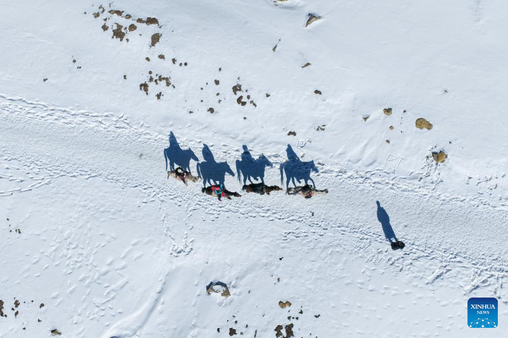 BEIJING, 20 febrero, 2026 (Xinhua) -- Vista aérea tomada con un dron de turistas montando a caballo en una montaña nevada, en el distrito autónomo hui de Menyuan, en la prefectura autónoma tibetana de Haibei, en la provincia de Qinghai, en el noroeste de China, el 20 de febrero de 2026. El Ministerio de Cultura y Turismo de China lanzó una campaña cultural y turística de un mes de duración previo a la Fiesta de la Primavera, que incluye una amplia gama de actividades y medidas promocionales para satisfacer mejor las necesidades de la población. (Xinhua/Zhang Long)
