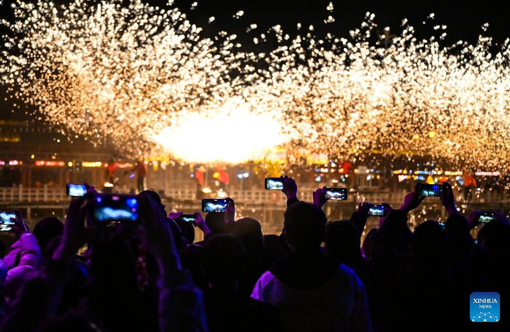 BEIJING, 20 febrero, 2026 (Xinhua) -- Imagen del 19 de febrero de 2026 de turistas observando fuegos artificiales de hierro fundido en una feria del templo, en la ciudad de Shangqiu, en la provincia de Henan, en el centro de China. El Ministerio de Cultura y Turismo de China lanzó una campaña cultural y turística de un mes de duración previo a la Fiesta de la Primavera, que incluye una amplia gama de actividades y medidas promocionales para satisfacer mejor las necesidades de la población. (Xinhua/Li Heng)