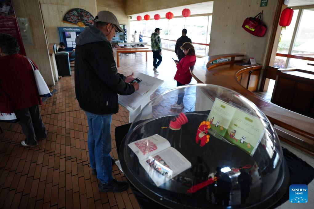 Imagen del 21 de febrero de 2026 de una mujer observando una exposición sobre medicina tradicional china durante la celebración del Año Nuevo chino organizada por la Casa Colombo China Brigada SOS, en Bogotá, Colombia. Con la retransmisión de la cuenta regresiva para la llegada del Año Nuevo chino culminó el sábado la semana de actividades culturales para esta celebración en la biblioteca pública Virgilio Barco de la ciudad de Bogotá, Colombia. (Xinhua/Andrés Moreno)