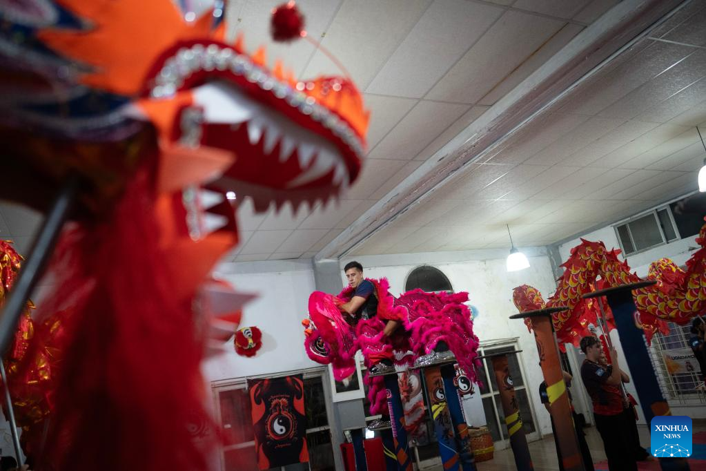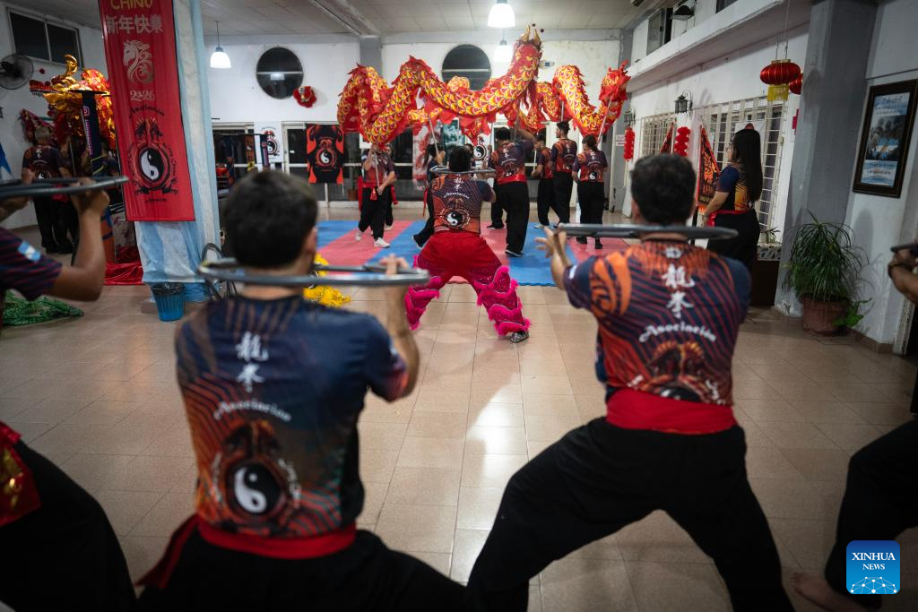 HAEDO, 23 febrero, 2026 (Xinhua) -- Imagen del 20 de febrero de 2026 de alumnos de la Asociación Lung Chuan realizando un entrenamiento de la danza del león y la danza del dragón en una de las sedes de la asociación, en la localidad de Haedo, en la provincia de Buenos Aires, Argentina. La tradicional danza del dragón y del león, que recientemente abrió los festejos por el Año Nuevo chino en la ciudad de Buenos Aires, marcó este año un nuevo hito en Argentina al incorporar por primera vez la modalidad sobre postes, una variante en altura que exige mayor destreza, coordinación y preparación física. (Xinhua/Martín Zabala)