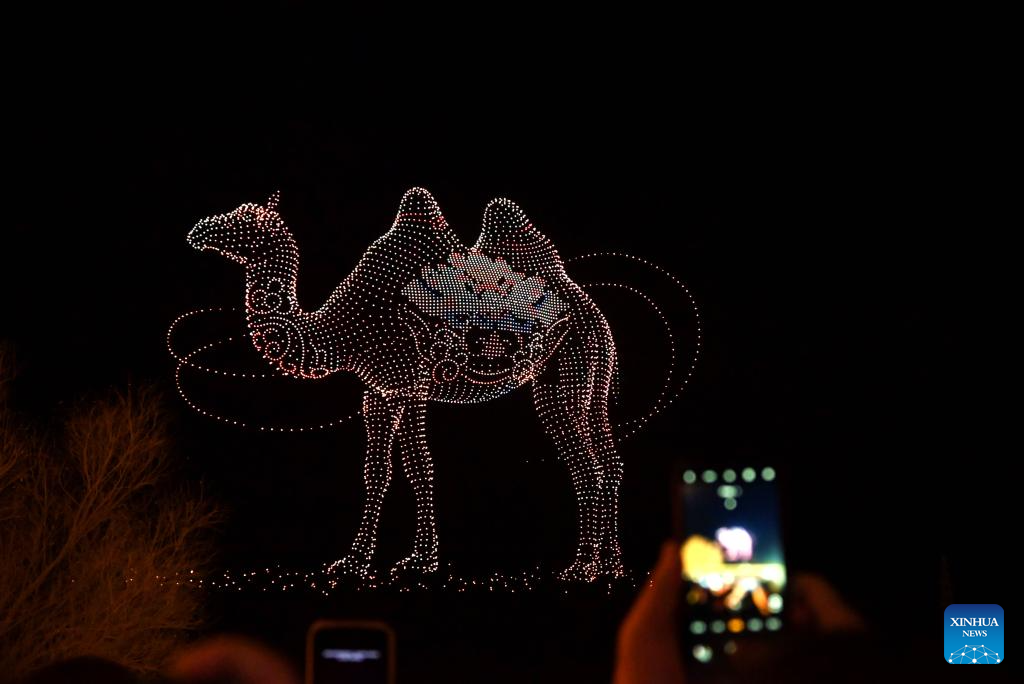 DUNHUANG, 23 febrero, 2026 (Xinhua) -- Imagen del 22 de febrero de 2026 de personas observando un espectáculo de drones en un punto escénico, en Dunhuang, en la provincia de Gansu, en el noroeste de China. (Xinhua/Zhang Xiaoliang)