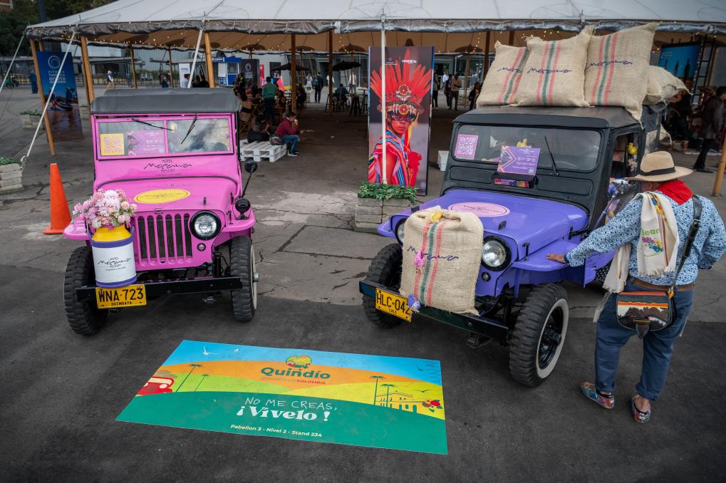 Imagen del 25 de febrero de 2026 de un hombre observando vehículos utilizados para la recolección de café durante la 45ª edición de la vitrina turística de la Asociación Colombiana de Agencias de Viajes y de Turismo (ANATO), en Bogotá, capital de Colombia.La 45ª edición de la vitrina turística de ANATO comenzó el miércoles con el Caribe mexicano como región internacional invitada de honor y el departamento colombiano de Córdoba como región nacional destacada. (Xinhua/Andrés Moreno)