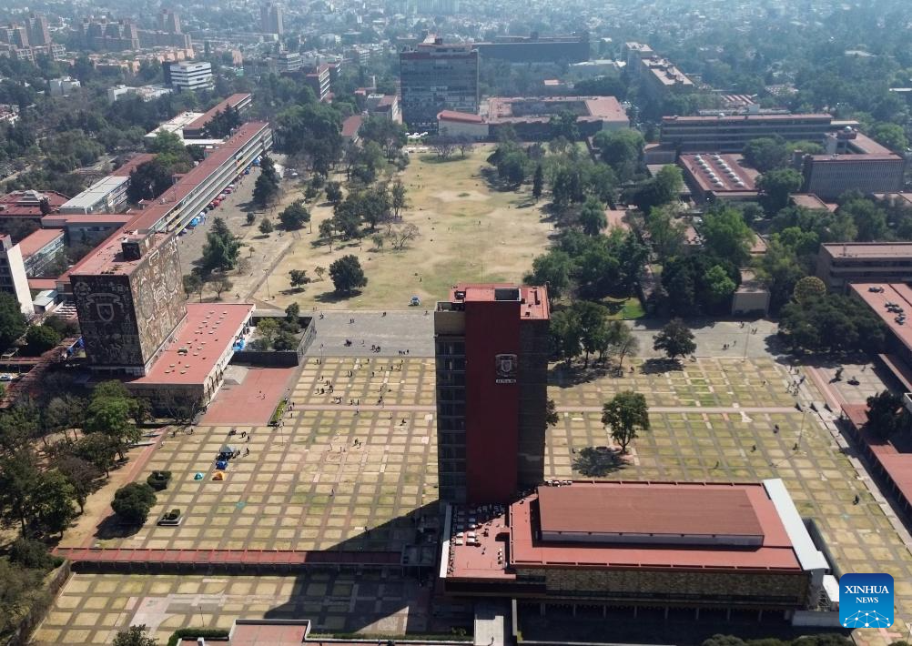 CIUDAD DE MEXICO, 27 febrero, 2026 (Xinhua) -- Imagen tomada con un dron el 27 de febrero de 2026 del campus central de la Universidad Nacional Autónoma de México (UNAM), en la Ciudad de México, capital de México. La UNAM, la máxima casa de estudios del país y una de las más importantes del mundo, es un referente cultural y arquitectónico de alcance internacional. (Xinhua/Francisco Cañedo)