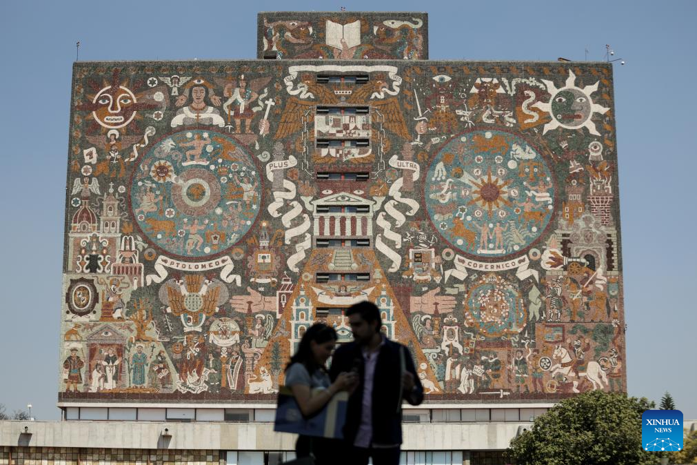 CIUDAD DE MEXICO, 27 febrero, 2026 (Xinhua) -- Personas caminan frente a la Biblioteca Central de la Universidad Nacional Autónoma de México (UNAM), en la Ciudad de México, capital de México, el 27 de febrero de 2026. La UNAM, la máxima casa de estudios del país y una de las más importantes del mundo, es un referente cultural y arquitectónico de alcance internacional. (Xinhua/Francisco Cañedo)