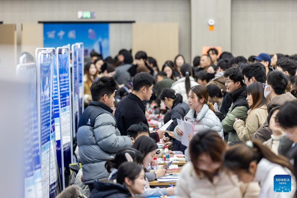 BEIJING, 27 febrero, 2026 (Xinhua) -- Imagen del 26 de febrero de 2026 de solicitantes de empleo asistiendo a una feria de empleo para graduados universitarios, en Huzhou, en la provincia de Zhejiang, en el este de China. Recientemente se han celebrado diversas ferias de empleo en todo el país para proporcionar puestos vacantes a los solicitantes de empleo. (Xinhua/Yi Fan)