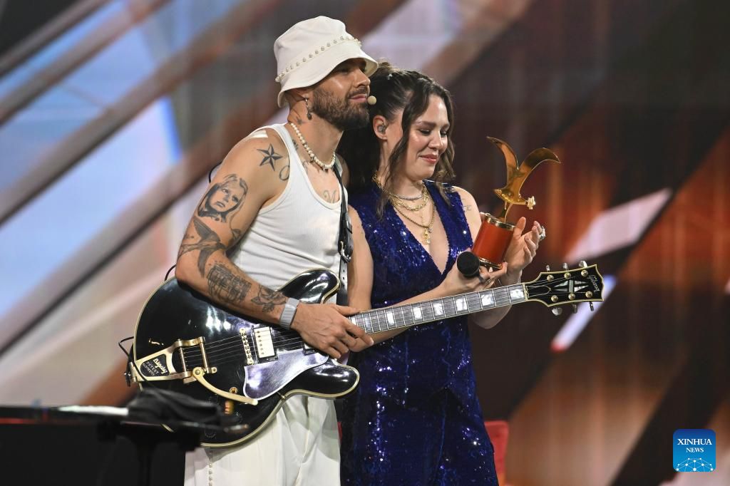 VIÑA DEL MAR, 27 febrero, 2026 (Xinhua) -- Imagen del 24 de febrero de 2026 del dueto mexicano, Jesse & Joy, reaccionando después de recibir la Gaviota de Oro durante la 65ª versión del Festival Internacional de la Canción de Viña del Mar, en Viña del Mar, Chile. (Xinhua/Jorge Villegas)
