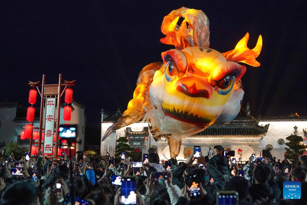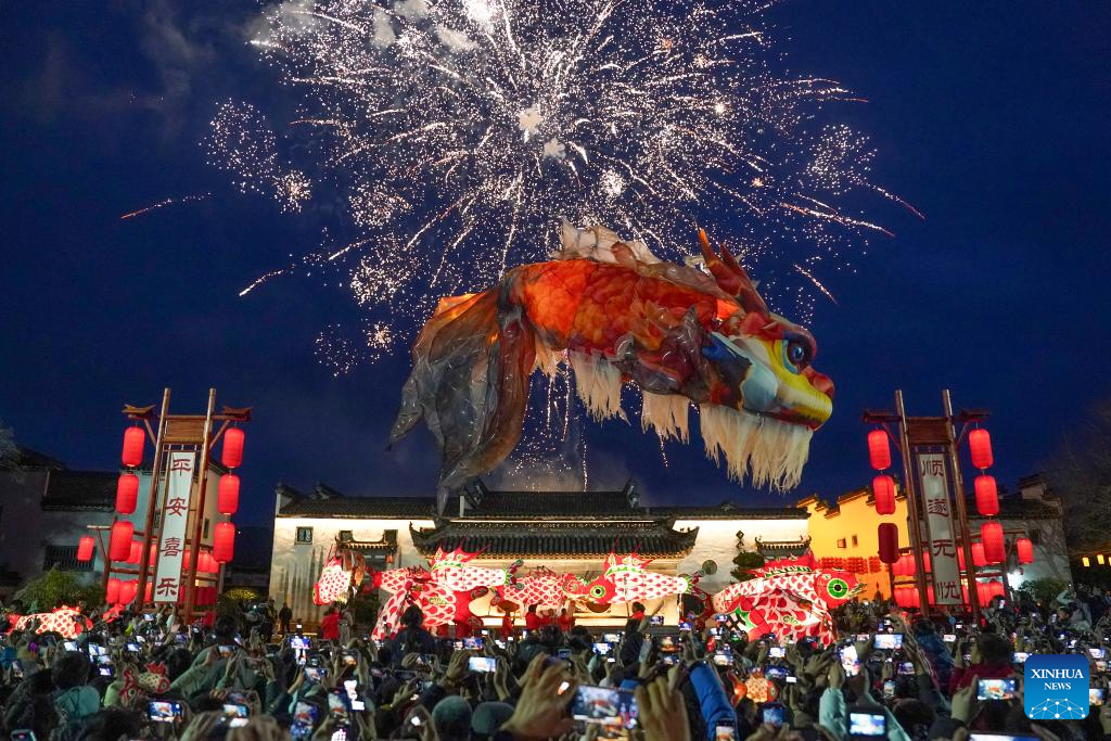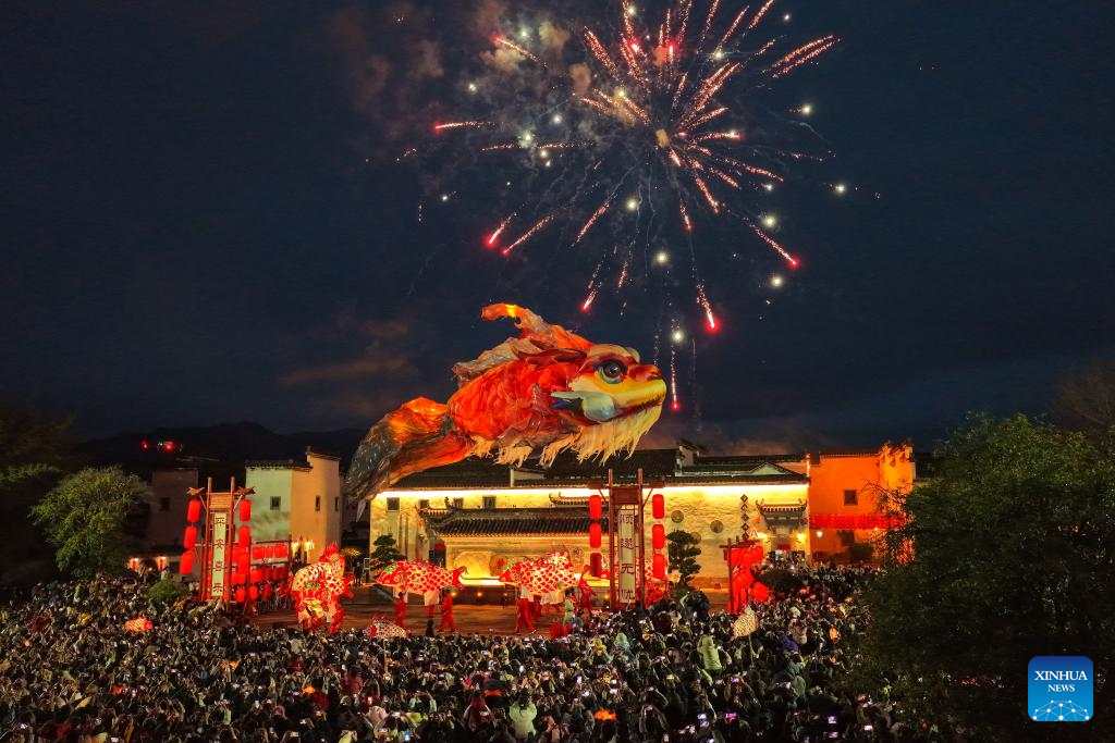 Desfile de linternas de Pez Ao se lleva a cabo en poblado antiguo de Tangmo, Anhui | Spanish.xinhuanet.com