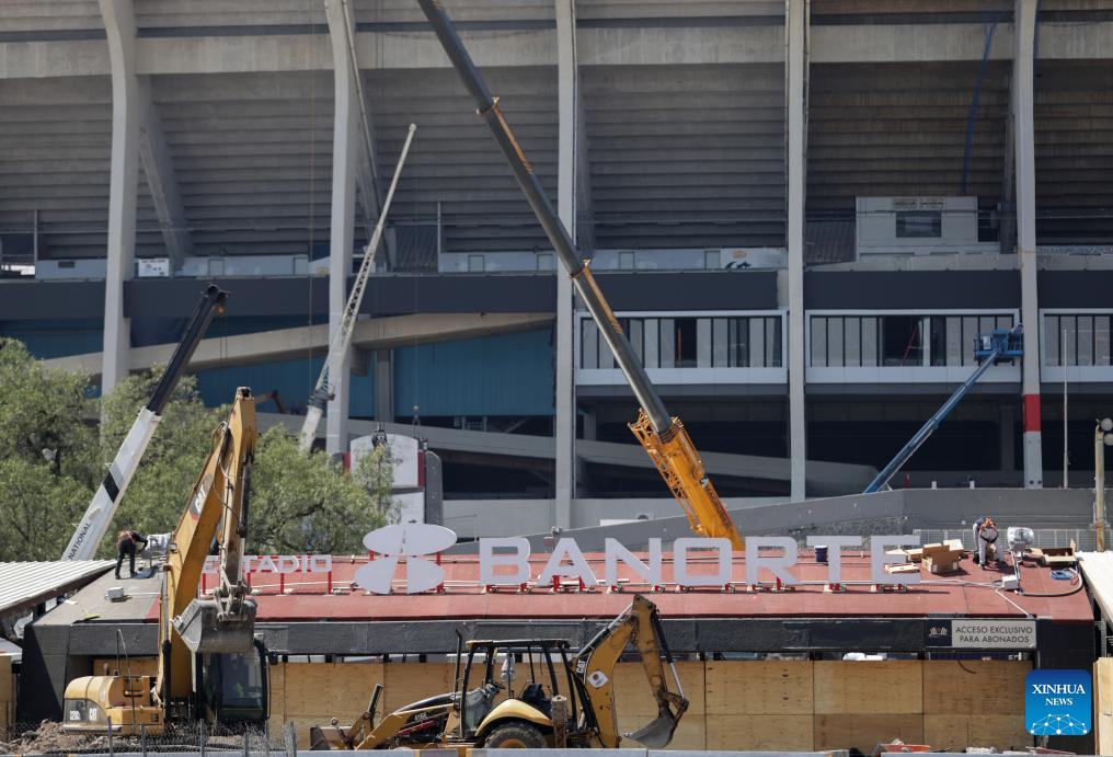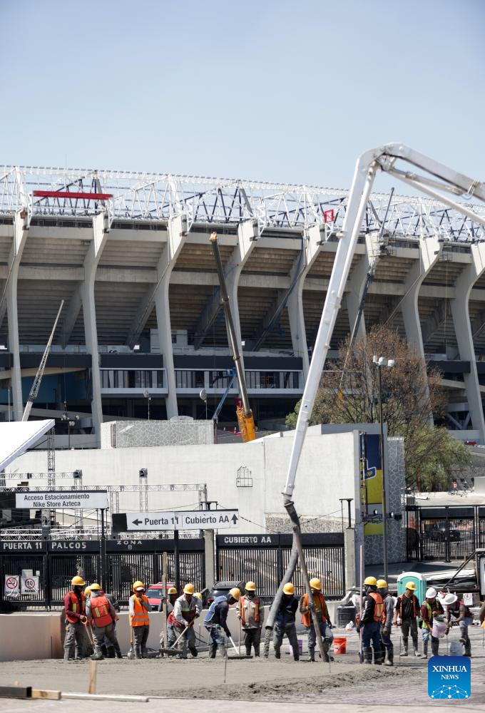 CIUDAD DE MEXICO, 3 marzo, 2026 (Xinhua) -- Trabajadores laboran en las obras de remodelación del simbólico Estadio Azteca de la Ciudad de México a 100 días del inicio de la Copa Mundial de Fútbol FIFA 2026, en la Ciudad de México, capital de México, el 3 de marzo de 2026. (Xinhua/Li Muzi)