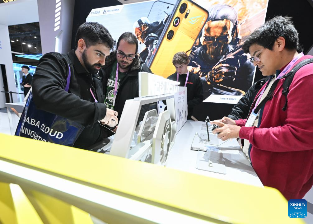 BARCELONA, 5 marzo, 2026 (Xinhua) -- Personas prueban un dispositivo para gaming de Nubia de China durante el Congreso Mundial de Móviles (MWC, por sus siglas en inglés) 2026, en Barcelona, España, el 5 de marzo de 2026. El MWC 2026 concluyó aquí el jueves. (Xinhua/Cheng Min)