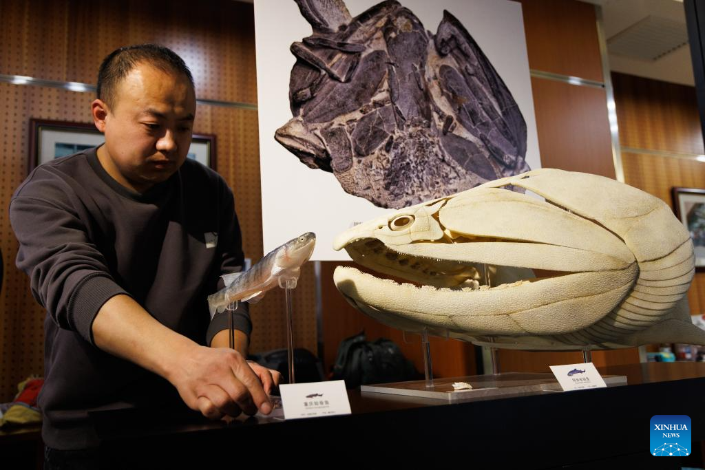 BEIJING, 5 marzo, 2026 (Xinhua) -- Imagen del 3 de marzo de 2026 de un trabajador colocando modelos de Eosteus chongqingensis (i) y Megamastax amblyodus restaurados en el Instituto de Paleontología y Paleoantropología de Vertebrados de la Academia de Ciencias de China, en Beijing, capital de China. Los fósiles de dos peces de hace más de 400 millones de años, uno era una diminuta criatura aerodinámica y el otro un gigante entre los vertebrados de su tiempo con dientes extraños, han sido descubiertos en China, llenando un vacío crucial en el proceso evolutivo "de pez a humano". (Xinhua/Jin Liwang)