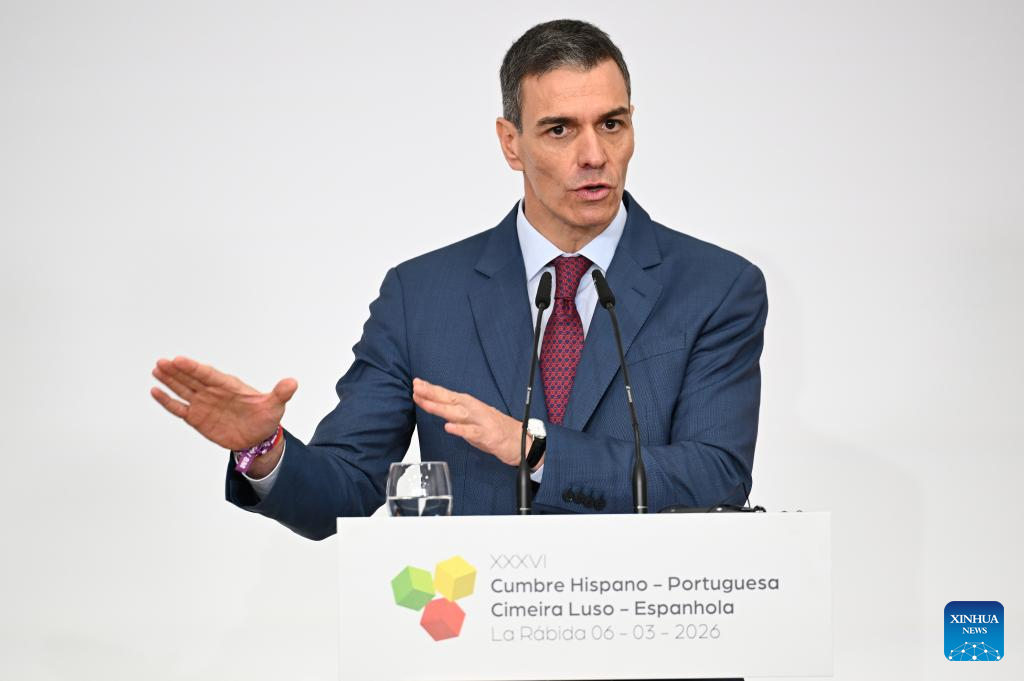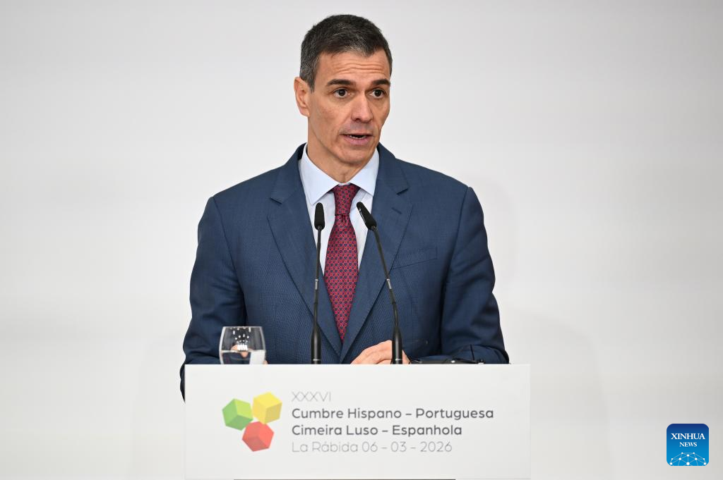 HUELVA, 6 marzo, 2026 (Xinhua) -- Imagen proveída por La Moncloa del presidente del Gobierno español, Pedro Sánchez, hablando durante una conferencia de prensa después de la Cumbre Hispano-Portuguesa, en La Rábida, en Huelva, España, el 6 de marzo de 2026. Sánchez afirmó el viernes que la acción militar de Estados Unidos e Israel contra Irán constituye un "error extraordinario" y rechazó las críticas del presidente estadounidense, Donald Trump, por la negativa de España a permitir que Estados Unidos utilice sus bases en el país en el actual asalto aéreo. (Xinhua/La Moncloa)