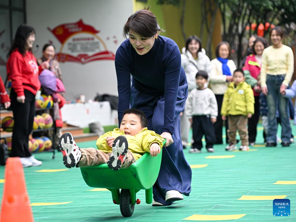 BEIJING, 7 marzo, 2026 (Xinhua) -- Imagen del 6 de marzo de 2026 de una madre participando en un juego divertido junto a su hijo durante una actividad para celebrar el Día Internacional de la Mujer en un jardín de niños, en Nanjing, en la provincia de Jiangsu, en el este de China. Diversos eventos se llevaron a cabo recientemente en China para conmemorar el Día Internacional de la Mujer. (Xinhua/Fang Dongxu)