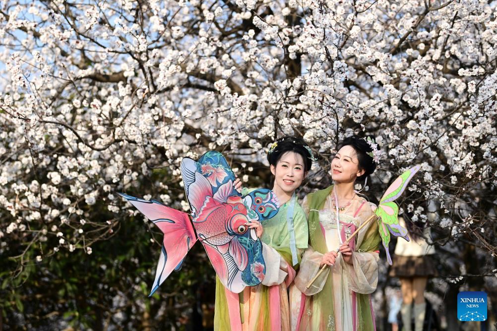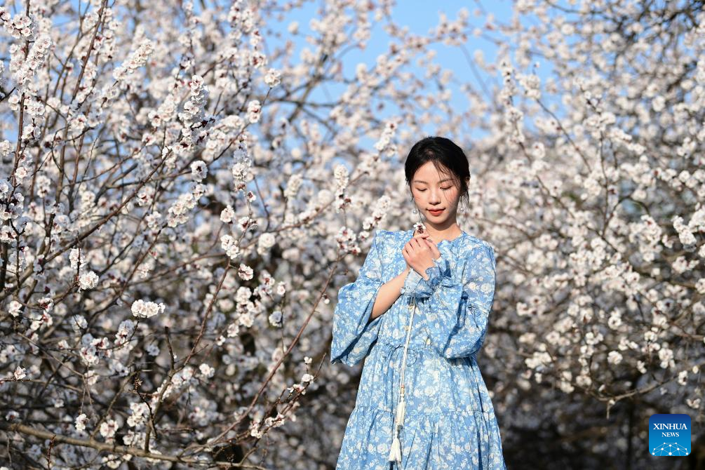 XI'AN, 9 marzo, 2026 (Xinhua) -- Una turista posa para fotografías con árboles en flor en el Parque del Patrimonio Nacional del Palacio Daming, en Xi'an, en la provincia de Shaanxi, en el noroeste de China, el 9 de marzo de 2026. Las flores retoñan mientras la temperatura incrementa en China. (Xinhua/Zou Jingyi)