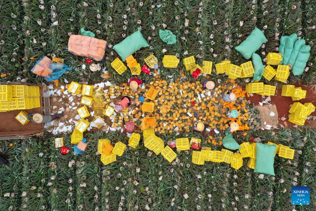 HAIKOU, 12 marzo, 2026 (Xinhua) -- Vista aérea tomada con un dron el 12 de marzo de 2026 de agricultores empacando piñas, en el poblado de Dapo de Haikou, en la provincia de Hainan, en el sur de China. (Xinhua/Guo Cheng)