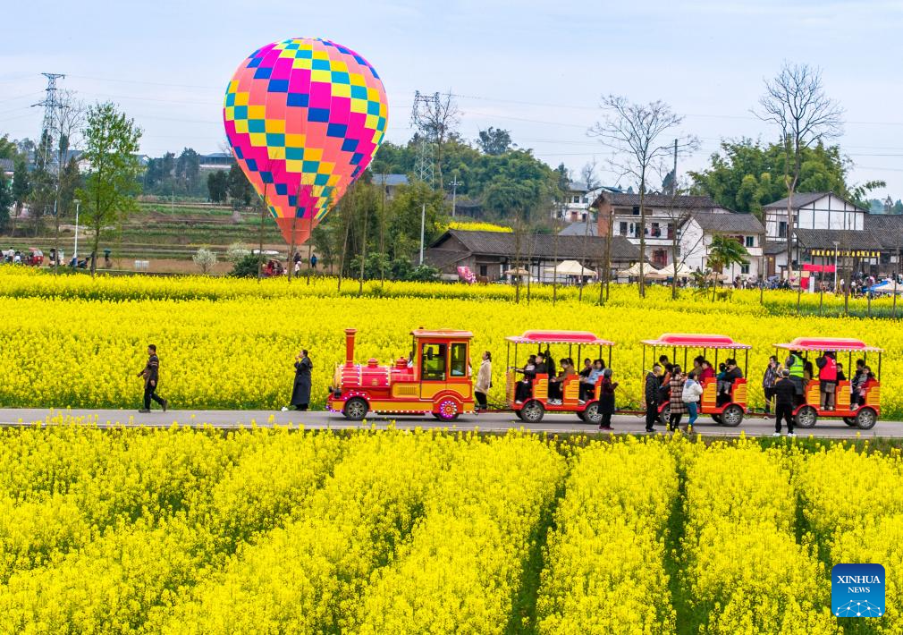 BEIJING, 12 marzo, 2026 (Xinhua) -- Imagen tomada con un dron del 8 de marzo de 2026 de turistas disfrutando de flores de colza, en el poblado de Huaqiao de la ciudad de Guang'an, en la provincia de Sichuan, en el suroeste de China. (Xinhua/Zhang Guosheng)