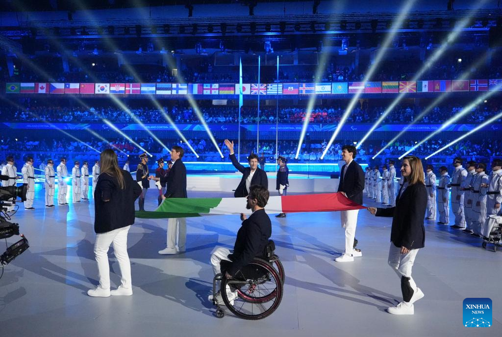 CORTINA D'AMPEZZO, 16 marzo, 2026 (Xinhua) -- Imagen del 15 de marzo de 2026 de abanderados portando la bandera nacional italiana durante la ceremonia de clausura de los Juegos Paralímpicos de Invierno Milán-Cortina 2026, en Cortina D'ampezzo, Italia. (Xinhua/Hou Jun)