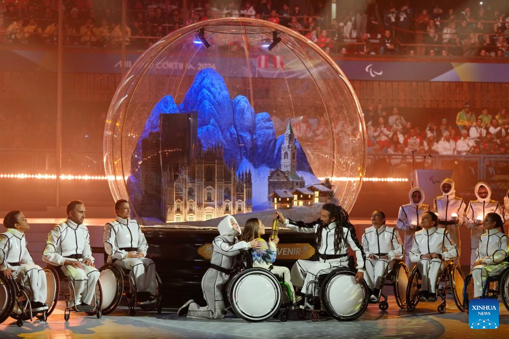 CORTINA D'AMPEZZO, 16 marzo, 2026 (Xinhua) -- Imagen del 15 de marzo de 2026 de artistas realizando una presentación durante la ceremonia de clausura de los Juegos Paralímpicos de Invierno Milán-Cortina 2026, en Cortina D'ampezzo, Italia. (Xinhua/Wang Kaiyan)