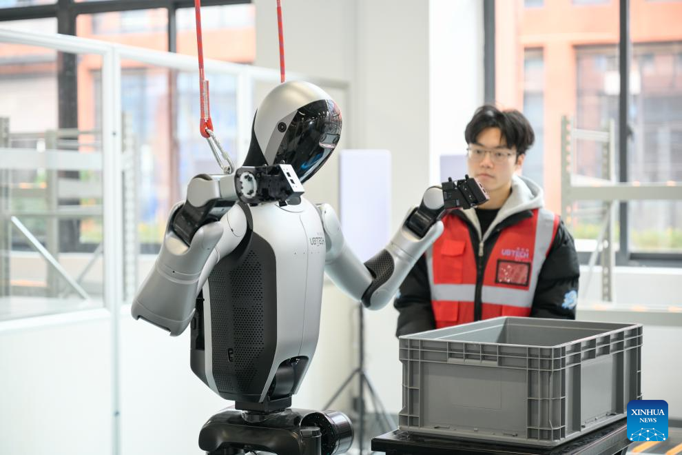 ZIGONG, 16 marzo, 2026 (Xinhua) -- Imagen del 8 de enero de 2026 de un robot humanoide recibiendo entrenamiento para cargar objetos en el Centro de Recopilación y Pruebas de Datos Multimodales de Robots Humanoides de Sichuan, en la ciudad de Zigong, en la provincia de Sichuan, en el suroeste de China. Mediante la simulación de escenarios industriales reales, el centro entrena a robots para que realicen acciones básicas como "agarrar, sujetar, recoger y colocar", acumulando enormes cantidades de datos de alta calidad. (Xinhua)