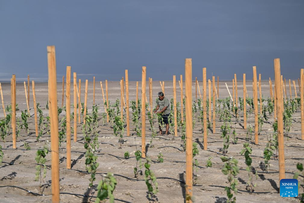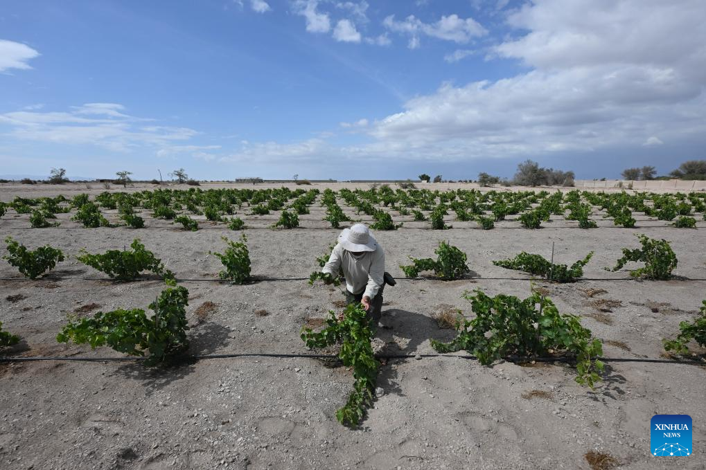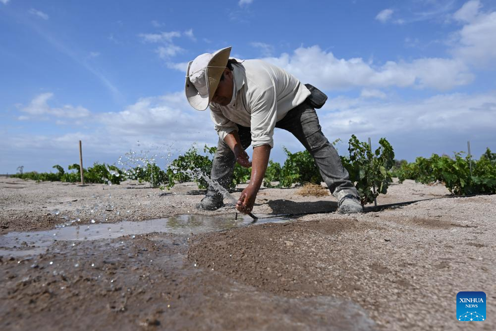 Imagen del 22 de enero de 2026 de un trabajador laborando en el viñedo "El Carmelo", en La Tirana, en la comuna de Pozo Almonte, en la región de Tarapacá, Chile. El trabajo mancomunado entre una universidad pública chilena y empresarios agrícolas permite producir los "vinos del desierto", cepas que gracias al conocimiento creado en la academia potencia a privados para descorchar vinos en el corazón del desierto chileno de Atacama, uno de los escenarios más adversos del mundo para la agricultura. (Xinhua/Jorge Villegas)