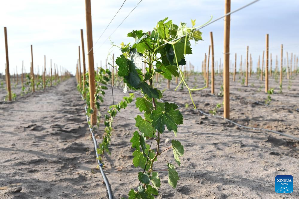 Imagen del 22 de enero de 2026 de una parra en crecimiento del viñedo "Doña Franitza de los Puquio", en La Huayca, en la región de Tarapacá, Chile. El trabajo mancomunado entre una universidad pública chilena y empresarios agrícolas permite producir los "vinos del desierto", cepas que gracias al conocimiento creado en la academia potencia a privados para descorchar vinos en el corazón del desierto chileno de Atacama, uno de los escenarios más adversos del mundo para la agricultura. (Xinhua/Jorge Villegas)
