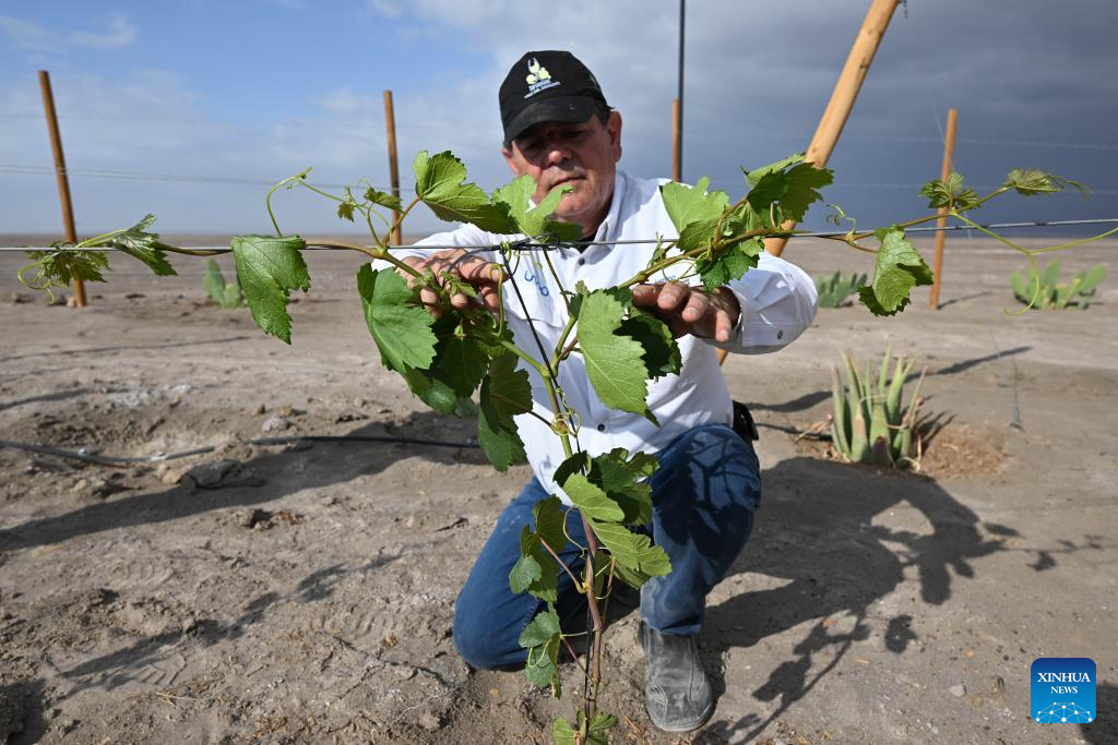 Imagen del 22 de enero de 2026 de Marcelo Lanino, líder del proyecto "Vino del Desierto" y académico de la Universidad Arturo Prat, manipulando una parra del viñedo "Doña Franitza de los Puquio", en La Huayca, en la región de Tarapacá, Chile. El trabajo mancomunado entre una universidad pública chilena y empresarios agrícolas permite producir los "vinos del desierto", cepas que gracias al conocimiento creado en la academia potencia a privados para descorchar vinos en el corazón del desierto chileno de Atacama, uno de los escenarios más adversos del mundo para la agricultura. (Xinhua/Jorge Villegas)