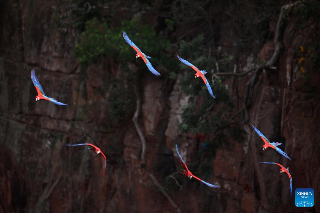 MATO GROSSO DO SUL, 19 marzo, 2026 -- Guacamayas bandera vuelan en Buraco das Araras, en el municipio de Jardim, en el estado de Mato Grosso do Sul, Brasil, el 19 de marzo de 2026. (Xinhua/Lucio Tavora)