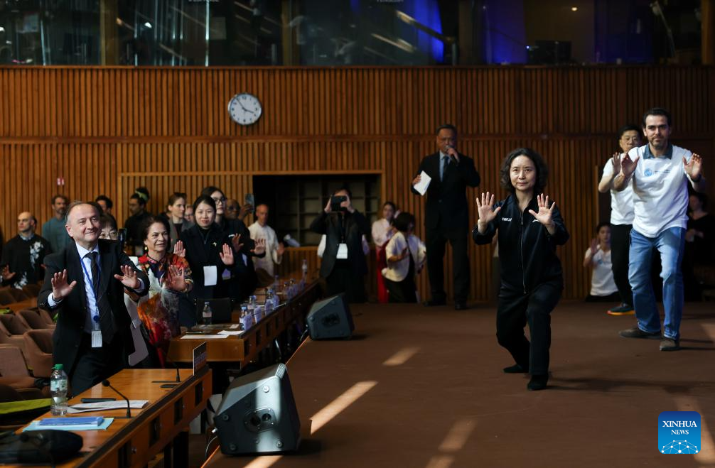 PARIS, 19 marzo, 2026 (Xinhua) -- Imagen del 18 de marzo de 2026 de Zhang Yuping, secretaria general de la Federación Internacional de Wushu, saludando al público durante el evento de celebración, en París, Francia. Una celebración previa al primer Día Internacional del Taijiquan, que se celebrará el 21 de marzo, se llevó a cabo el miércoles en la sede de la Organización de las Naciones Unidas para la Educación, la Ciencia y la Cultura (UNESCO, por sus siglas en inglés) en París, bajo el lema "En forma para la vida, Ve por el taiji". (Xinhua/Wu Huiwo)