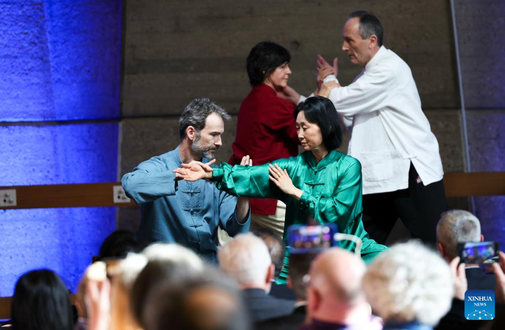PARIS, 19 marzo, 2026 (Xinhua) -- Imagen del 18 de marzo de 2026 de Zhang Yuping, secretaria general de la Federación Internacional de Wushu, mostrando movimientos de Taijiquan mientras el público participa durante el evento de celebración, en París, Francia. Una celebración previa al primer Día Internacional del Taijiquan, que se celebrará el 21 de marzo, se llevó a cabo el miércoles en la sede de la Organización de las Naciones Unidas para la Educación, la Ciencia y la Cultura (UNESCO, por sus siglas en inglés) en París, bajo el lema "En forma para la vida, Ve por el taiji". (Xinhua/Wu Huiwo)