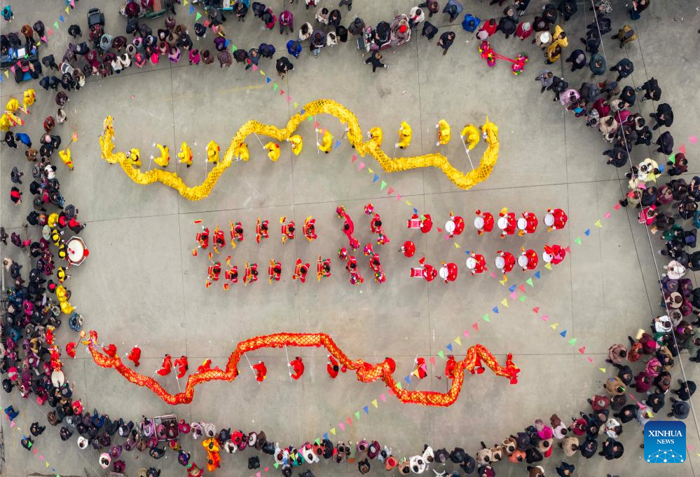 BEIJING, 20 marzo, 2026 (Xinhua) -- Vista aérea tomada con un dron el 20 de marzo de 2026 de una presentación de la danza de dragón durante una feria del templo tradicional, en la aldea de Xiaxi de Taizhou, en la provincia de Jiangsu, en el este de China. El equinoccio de primavera cae el 20 de marzo. Este año, también marca el Longtaitou, conocido como el Día del Dragón que Levanta la Cabeza, una ocasión importante en el calendario lunar, que se celebra con diversas actividades en toda China. (Xinhua/Tang Dehong)