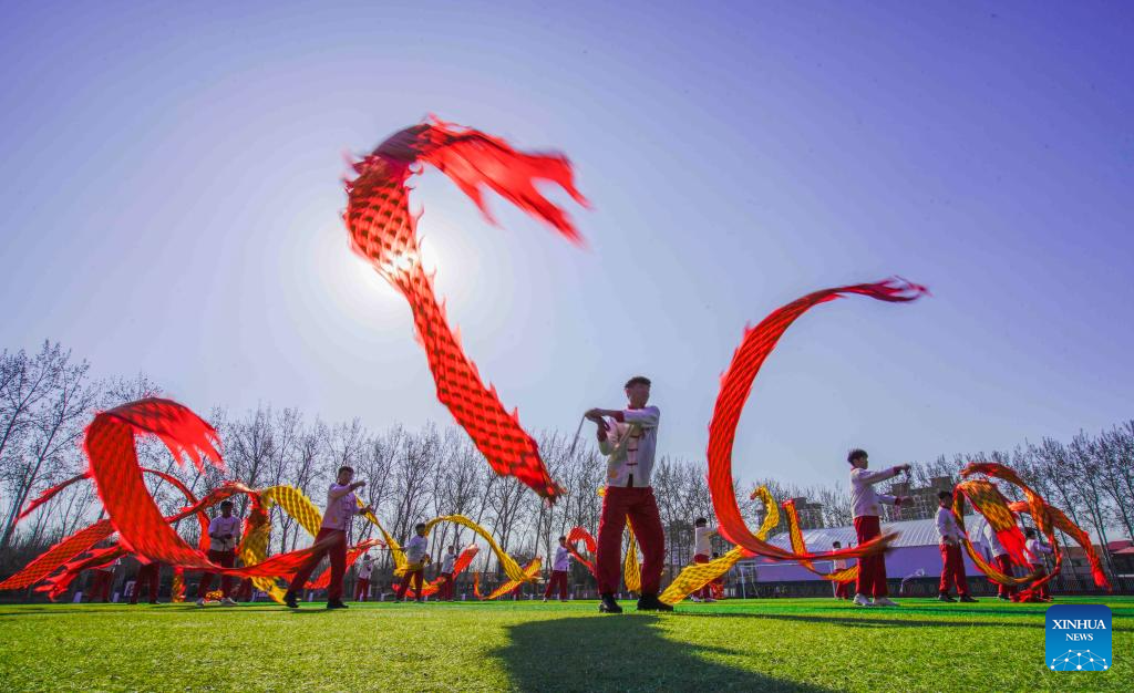 BEIJING, 20 marzo, 2026 (Xinhua) -- Estudiantes realizan la danza de dragón, en el distrito de Yutian, en la provincia de Hebei, en el norte de China, el 20 de marzo de 2026. El equinoccio de primavera cae el 20 de marzo. Este año, también marca el Longtaitou, conocido como el Día del Dragón que Levanta la Cabeza, una ocasión importante en el calendario lunar, que se celebra con diversas actividades en toda China. (Xinhua/Liu Mancang)