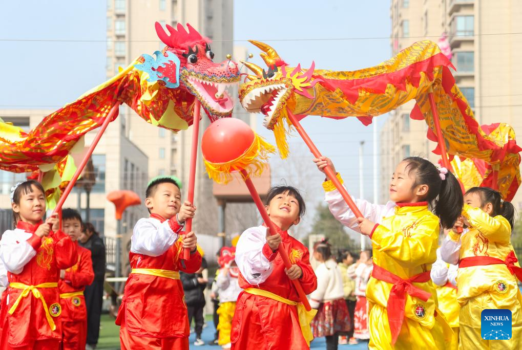 BEIJING, 20 marzo, 2026 (Xinhua) -- Niños realizan una danza del dragón, en Jurong, en la provincia de Jiangsu, en el este de China, el 20 de marzo de 2026. El equinoccio de primavera cae el 20 de marzo. Este año, también marca el Longtaitou, conocido como el Día del Dragón que Levanta la Cabeza, una ocasión importante en el calendario lunar, que se celebra con diversas actividades en toda China. (Xinhua/Zhong Xueman)