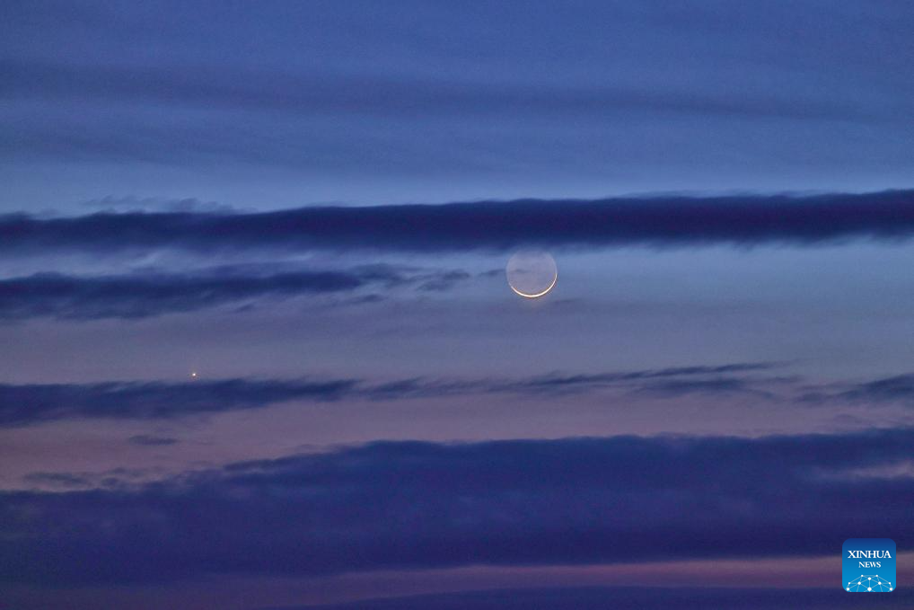 HARBIN, 20 marzo, 2026 (Xinhua) -- Imagen del 20 de marzo de 2026 del planeta Venus junto a la luna en el cielo crepuscular sobre la ciudad de Tongjiang, en la provincia de Heilongjiang, en el noreste de China. (Xinhua/Liu Wanping)