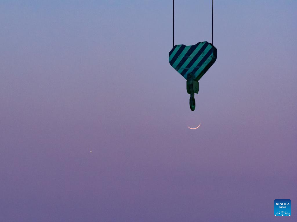 HARBIN, 20 marzo, 2026 (Xinhua) -- Imagen tomada con un dron el 20 de marzo de 2026 del planeta Venus junto a la luna en el cielo crepuscular sobre la ciudad de Shuangyashan, en la provincia de Heilongjiang, en el noreste de China. (Xinhua/Han Yang)