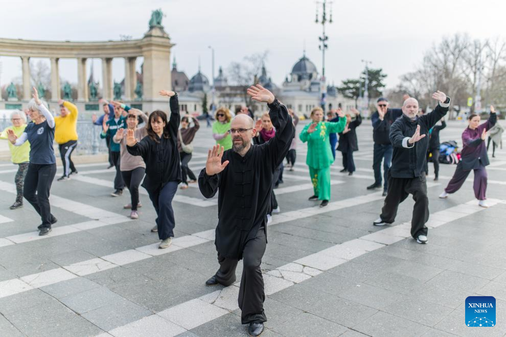 BUDAPEST, 21 marzo, 2026 (Xinhua) -- Entusiastas del Taijiquan realizan una presentación durante el evento de celebración, en Budapest, Hungría, el 21 de marzo de 2026. Una celebración por el primer Día Internacional del Taijiquan, organizada por la Federación Húngara de Wushu, se llevó a cabo aquí el sábado en la Plaza de los Héroes. (Xinhua/Marton Koncz)