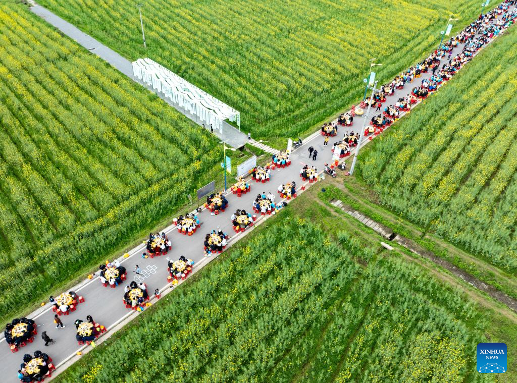 BEIJING, 22 marzo, 2026 (Xinhua) -- Vista aérea tomada con un dron del 21 de marzo de 2026 de personas disfrutando de un banquete en medio de flores de colza, en el poblado de Huaqiao de la ciudad de Guang'an, en la provincia de Sichuan, en el sur de China. Personas salen al aire libre y disfruta de la naturaleza mientras la primavera se extiende por toda China. (Xinhua/Zhang Guosheng)
