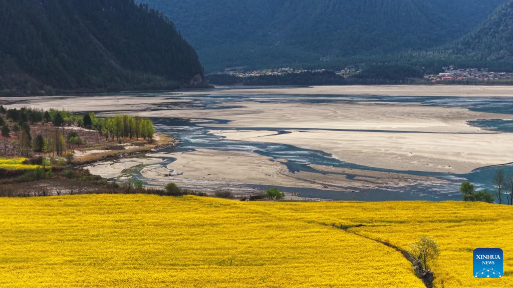 LHASA, 22 marzo, 2026 (Xinhua) -- Vista aérea tomada con un dron el 20 de marzo de 2026 de campos de flores de colza, en el distrito de Bomi de la ciudad de Nyingchi, en la región autónoma de Xizang, en el suroeste de China. Las flores de colza y durazno están aquí en plena floración, creando una escena pintoresca en la meseta. (Xinhua/Purbu Tsering)