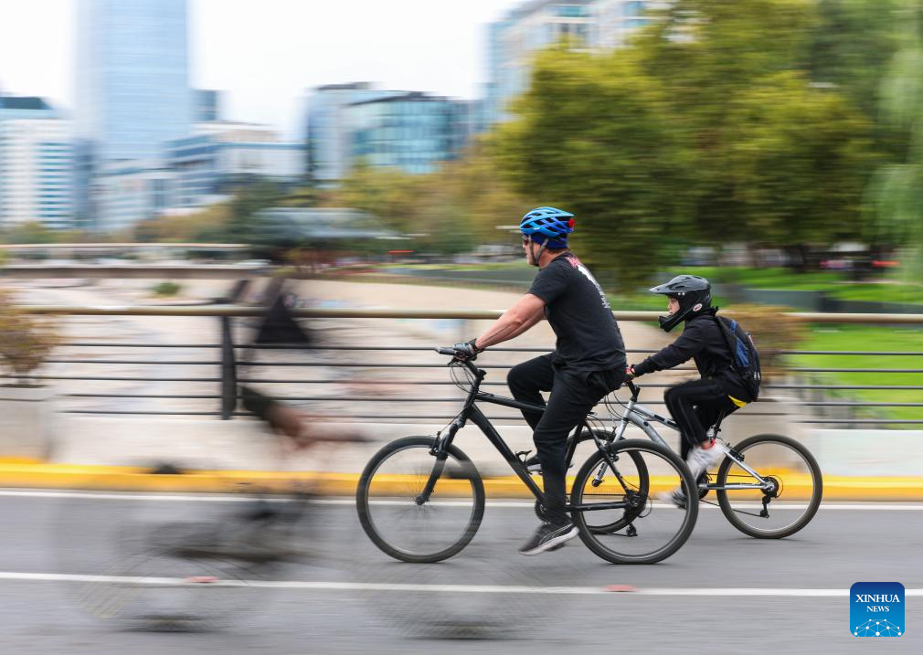 SANTIAGO, 23 marzo, 2026 (Xinhua) -- Imagen del 22 de marzo de 2026 de personas circulando en bicicleta durante el evento "Domingo sin automóviles", en Santiago, capital de Chile. Durante el evento, algunas calles de la capital chilena se convirtieron en zonas libres de automóviles desde las 9:00 hasta las 14:00, hora local, con vehículos motorizados prohibidos. (Xinhua/Zhou Jiayi)