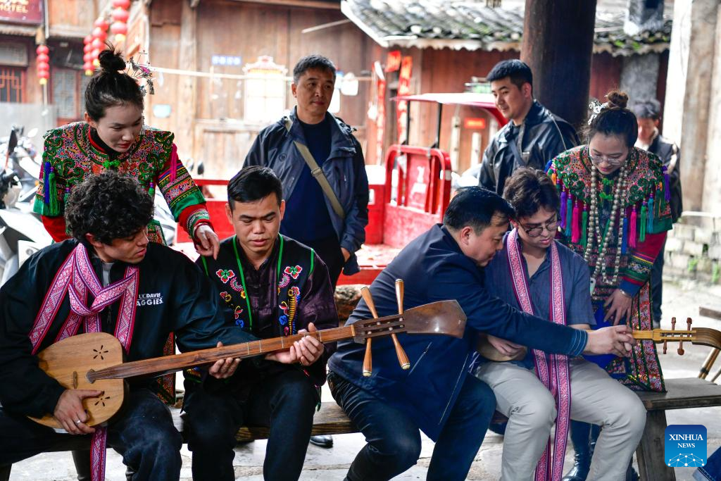 LIPING, 24 marzo, 2026 (Xinhua) -- Imagen del 23 de marzo de 2026 de residentes locales dando la bienvenida a los invitados, en la aldea dong de Zhaoxing, en el distrito de Liping, en la provincia de Guizhou, en el suroeste de China. El coro a capela The Whiffenpoofs de la Universidad de Yale visitó el distrito de Liping, en la provincia de Guizhou, en el suroeste de China, del 23 al 24 de marzo para participar en actividades de intercambio cultural. (Xinhua/Yang Wenbin)