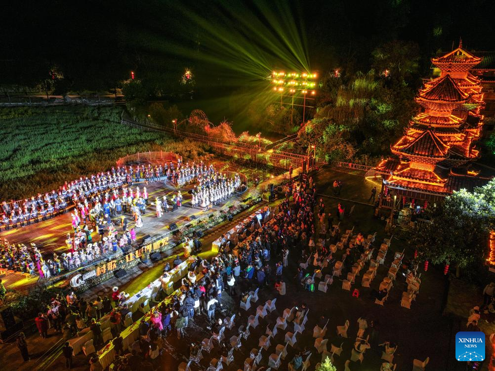 LIPING, 24 marzo, 2026 (Xinhua) -- Vista aérea tomada con un dron el 23 de marzo de 2026 de una gala de intercambio cultural, en la aldea dong de Zhaoxing, en el distrito de Liping, en la provincia de Guizhou, en el suroeste de China. El coro a capela The Whiffenpoofs de la Universidad de Yale visitó el distrito de Liping, en la provincia de Guizhou, en el suroeste de China, del 23 al 24 de marzo para participar en actividades de intercambio cultural. (Xinhua/Yang Wenbin)