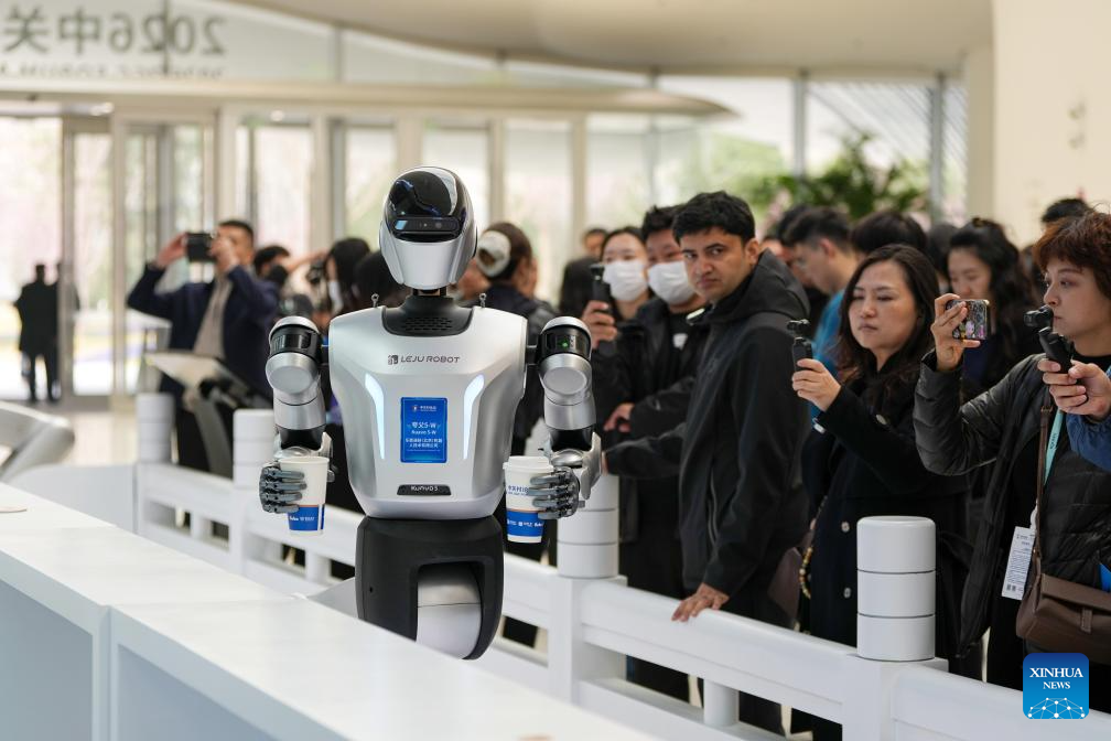 BEIJING, 24 marzo, 2026 (Xinhua) -- Un robot humanoide sirve bebidas en el Centro Internacional de Innovación de Zhongguancun, en Beijing, capital de China, el 24 de marzo de 2026. Bajo el lema "Integración total entre la innovación tecnológica y la industrial", el Foro Zhongguancun de este año se llevará a cabo en Beijing del 25 al 29 de marzo y se espera que la cifra de invitados participantes, procedentes de más de 100 países y regiones, sea superior a 1.000 y contará con alrededor de 100 eventos. (Xinhua/Ju Huanzong)