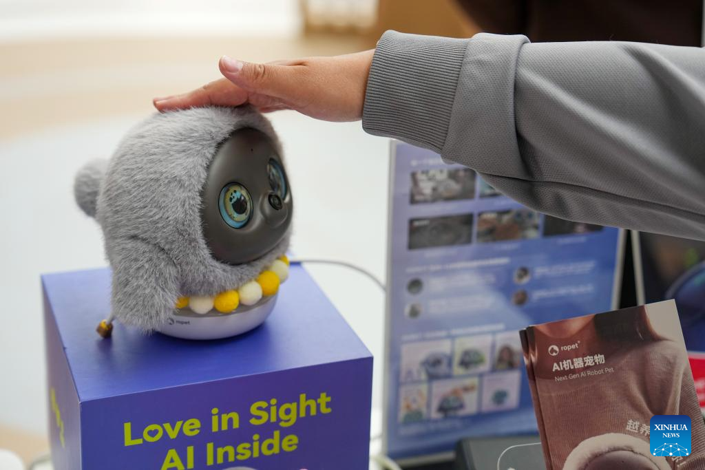 BEIJING, 24 marzo, 2026 (Xinhua) -- Un visitante interactúa con una mascota robot en el Centro Internacional de Innovación de Zhongguancun, en Beijing, capital de China, el 24 de marzo de 2026. Bajo el lema "Integración total entre la innovación tecnológica y la industrial", el Foro Zhongguancun de este año se llevará a cabo en Beijing del 25 al 29 de marzo y se espera que la cifra de invitados participantes, procedentes de más de 100 países y regiones, sea superior a 1.000 y contará con alrededor de 100 eventos. (Xinhua/Ju Huanzong)
